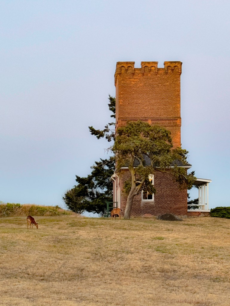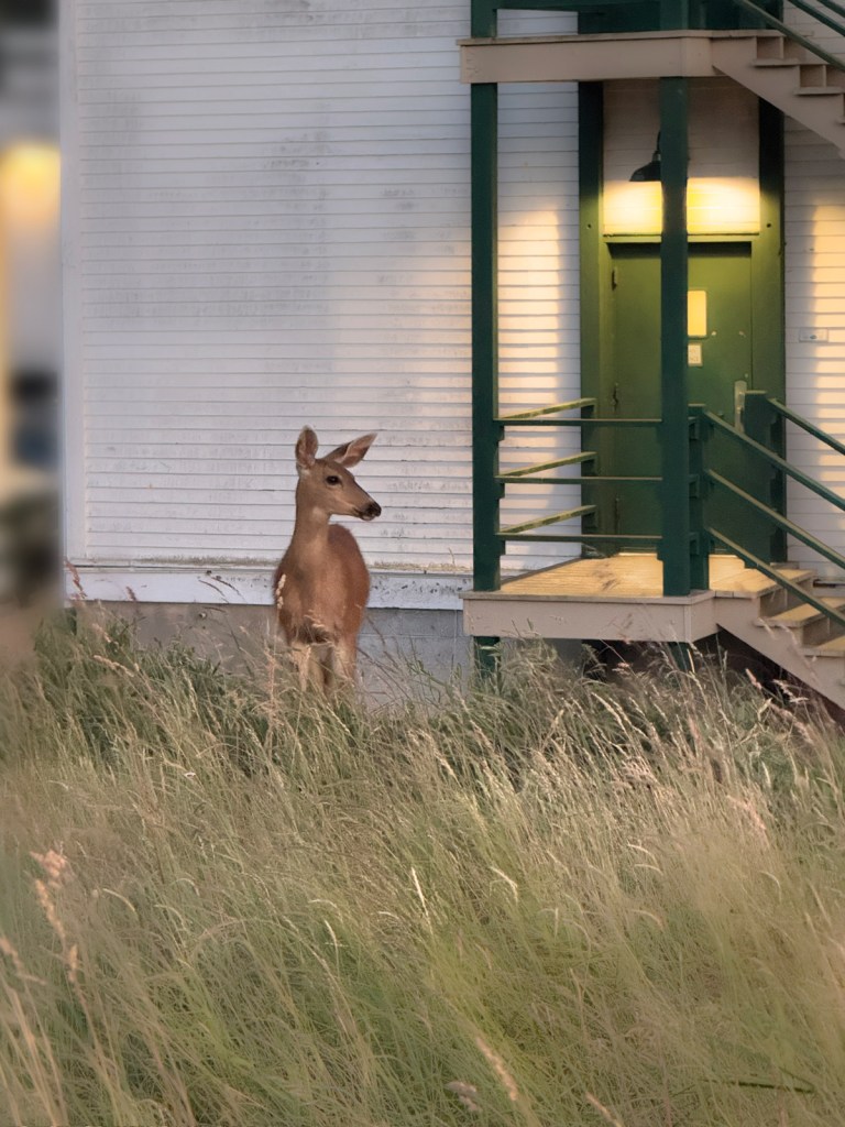 Perhaps my favorite moment of the day is a walk through the grounds as evening light falls on the barracks. The silence of their peeling paint and doors to nowhere, their austerity and restraint, make the bluff with its wild grasses and wind feel all the more wild. The deer wander at all hours, and if one is brooding over the predicament of a verb, or about meaning, or one’s own place in the sentence, their gaze is a welcome benediction.