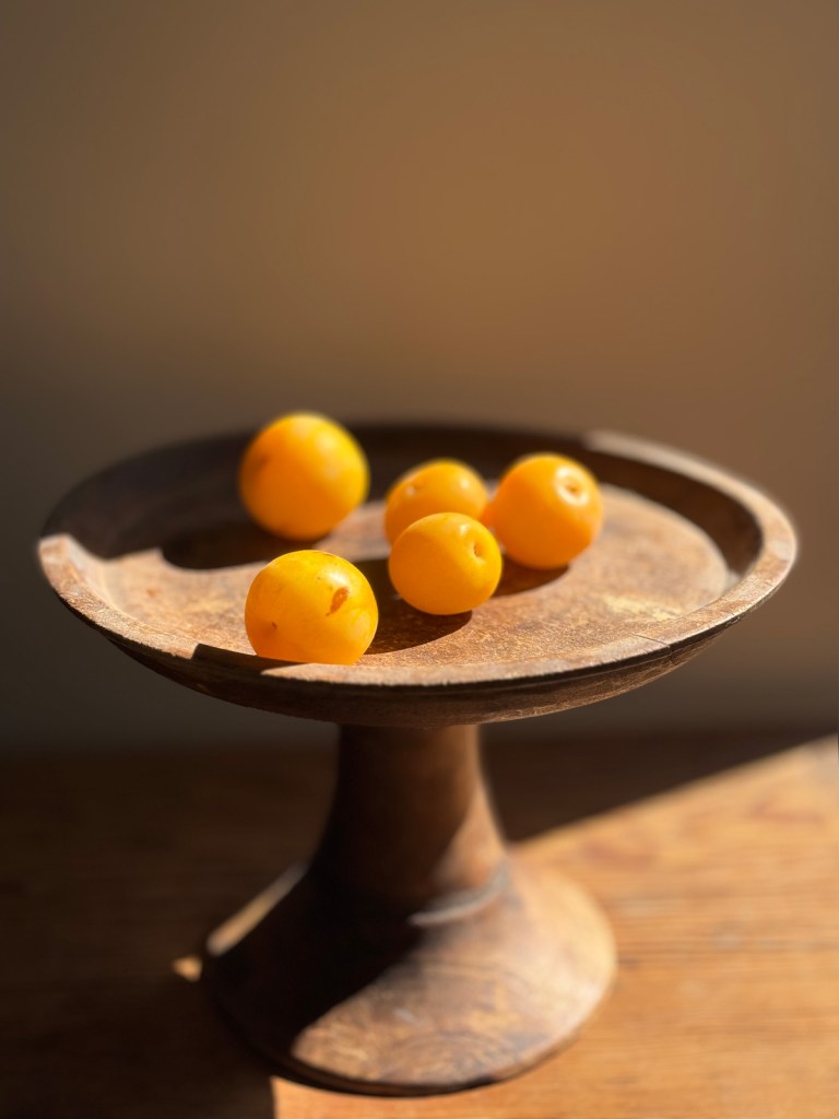On one of our afternoon walks we came upon a plum tree not yet stripped by deer. In the slanting light we gathered them, each one perfect, glowing orange like fire opals or tourmaline. I arranged them on a wooden pedestal and thought of Caravaggio’s opulent tumbles of fruit glazed in amber, and of the stillness of Muqui’s Six Persimmons, painted without color in shades of gray. In just the time since picking the fruit had changed, beginning its turn towards softness.